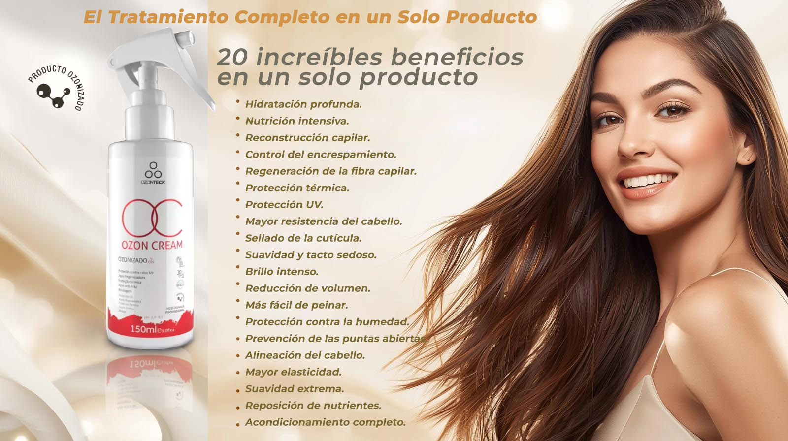 Experimenta el poder transformador de la Crema de Ozono 20 en 1 de Ozonteck y siente tu cabello más sano, protegido y con un brillo espectacular desde la primera aplicación.